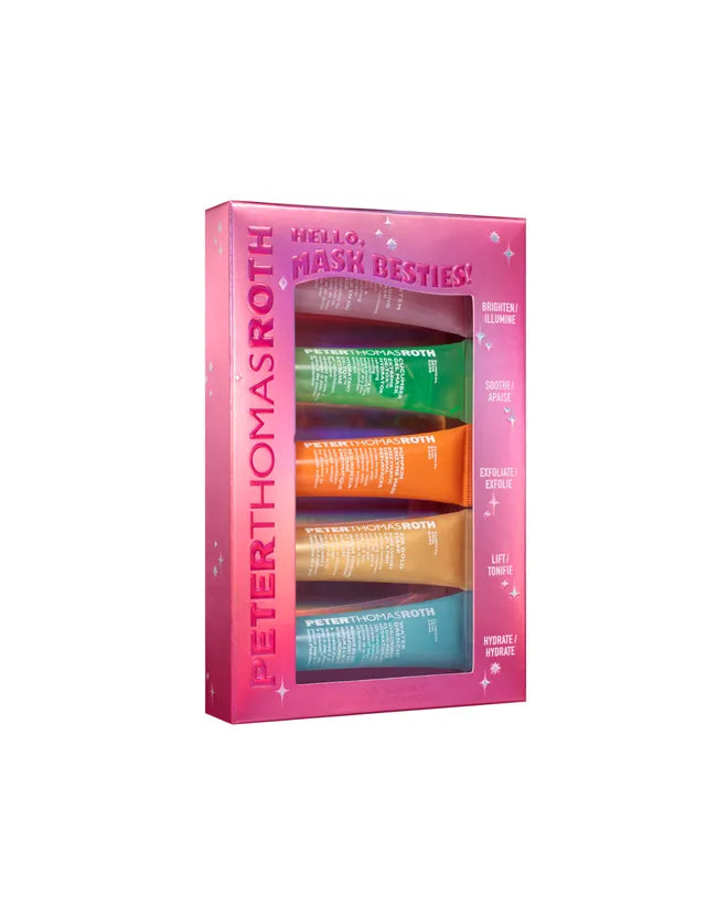 Peter Thomas Roth Hello, mask Besties är ett 5-delat kit med miniversioner av Peter Thomas Roths bästsäljande masker som rengör, lugnar, exfolierar, lyfter och återfuktar huden. Perfekt för multimaskering och för dig som vill ha strålande hud även när du är på språng.