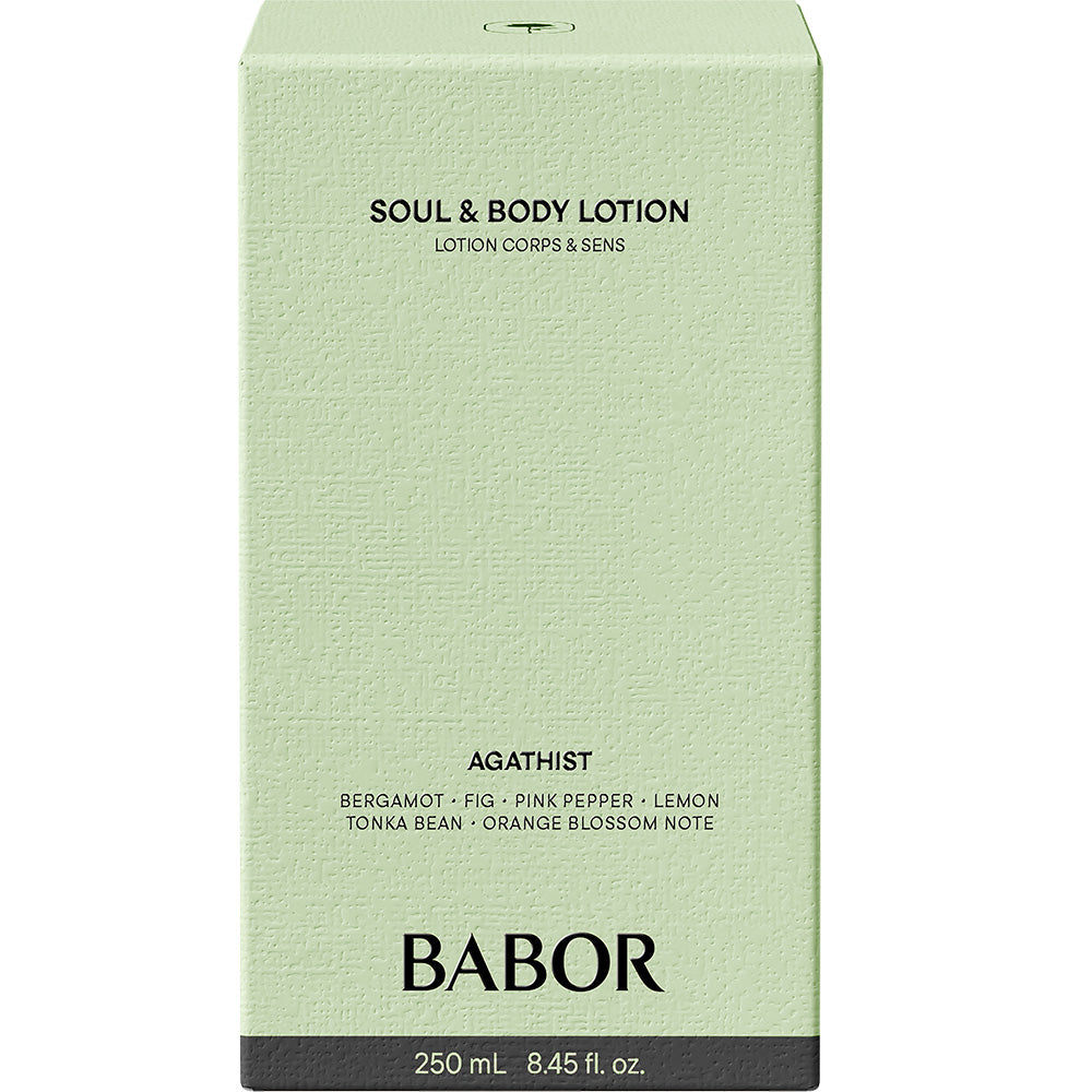 BABOR Soul & Body Lotion Agathist är en lätt, snabbt absorberande lotion som vårdar huden och lyfter sinnena. Doften av fikon, bergamott och tonkaböna skapar en fräsch och sensuell upplevelse, medan ceramider, hyaluronsyra och vitaminer återfuktar, skyddar och lugnar huden.